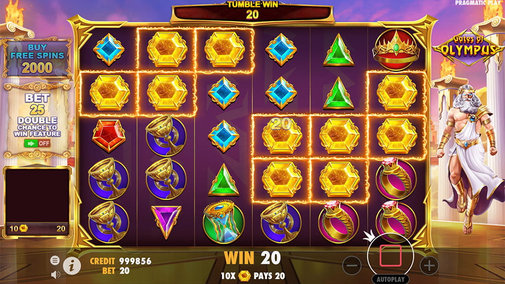 A jogabilidade da Gates of Olympus é rápida e acessível. Não existem linhas fixas; basta reunir oito ou mais símbolos iguais em qualquer posição. As vitórias ativam a função “Tumble”, removendo símbolos vencedores e adicionando novos, criando um efeito em cascata com múltiplas oportunidades de ganho.